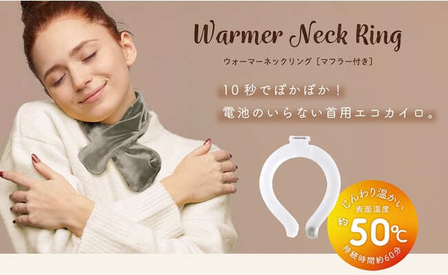真冬の通勤や通学、犬の散歩や子供の公園遊びのお供など寒い時期の外出は辛いと感じる方は多くいらっしゃるでしょう。そんな時に便利な「ウォーマーネックリング マフラー付き」が新発売。本体の金属ボタンをパチッと押し曲げると中の液体が発熱し、約10秒で50℃くらいまで温まります。そして、付属のマフラーにセットするだけで約60分適度な温度が続きます。寒い!と思った瞬間にボタンひとつで、いつでもどこでも快適温度が手に入ります。さらに、煮沸すれば約300回繰り返し使うことができます。