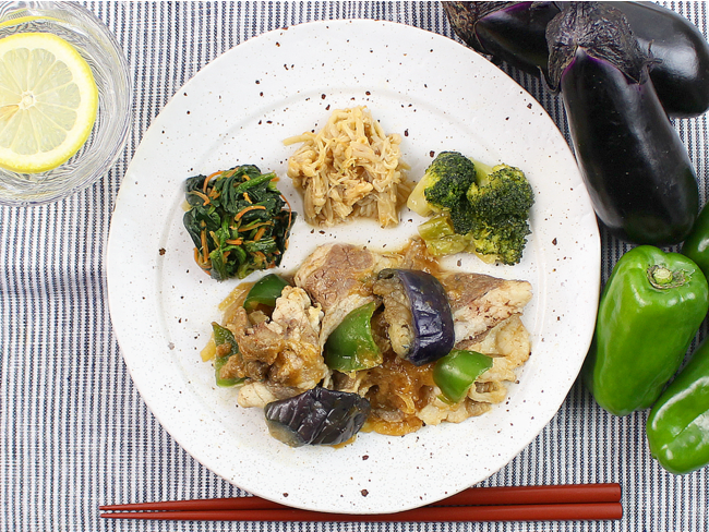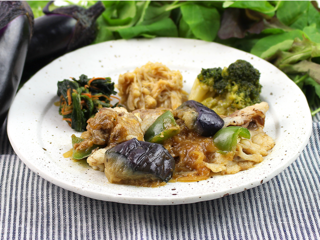 薄切りの牛肉にコクとうま味が特徴の味噌だれで仕上げました。長期熟成されたコクのある赤みそをベースに和風だしを加え、味の決め手となる大豆と米を原料とした無塩の味噌パウダーで塩分に配慮いたしました。添え野菜のたまねぎ、揚げ茄子、食感のよいピーマンと共にお召し上がりください。