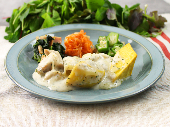 シュクメルリとはジョージア国の郷土料理で、鶏肉をにんにくが効いたホワイトソースで煮込んだものです。今回は具材に鶏もも肉、さつまいもを使用しております。また、チーズをトッピングすることでソースを濃厚に仕上げました。旨味たっぷりのソースはナッシュのバンズパンに付けて召し上がっていただくのもオススメです。パンとの相性はピッタリですので、是非お試しください。