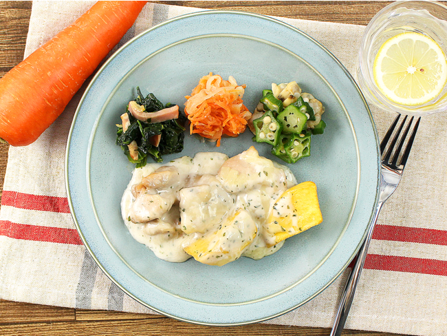 副菜は、ほうれん草ベーコンソテー、オニオンドレッシングで和えた人参と玉ねぎのコールスロー、オクラとあさりのサラダです。