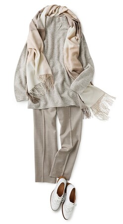 深い色が多くなる寒い時期には、思い切って淡いベージュのワントーンにチャレンジ。大判ストールが、暖かさと遊びをプラスしてくれます。パンツにはセンタープレス入りのスタイリッシュなデザインを選ぶことで、品のあるきれいめカジュアルスタイルに。