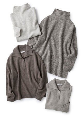 無染色素材は染色によるダメージが無い分、柔らかな風合いも魅力。ボトルネックニットは包まれるようなゆったりとしたチュニック丈。立体的に編み上げるホールガーメント仕立ては、原料ロスも少なく、フィット感のある着心地が特徴です。新鮮な印象のスキッパーニットは一枚で着るのはもちろん、寒い時期にはカットソーやニットとのレイヤードもおすすめです。