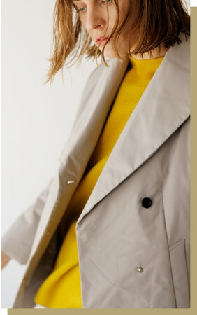 ハイクオリティーな裏地付きリバー仕立てのチェスターコート。ラ・エフでは素材のクオリティーに合わせ、特殊なミシンと手作業の工程が必要なリバー仕立ての生地を、吟味した工場で生産しています。チェスターコートの他、オーバーサイズがエレガントなショートコート、素材の良さを活かすためたっぷりと生地を使ったフーディーロングジレを展開しています。