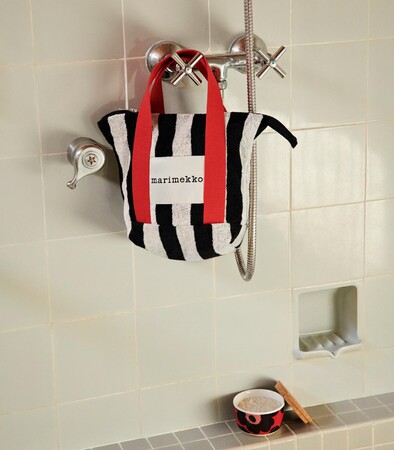 マリメッコの過去のコレクションで残ったタオルをアップサイクルしたスパバッグ。サウナへ行くときにもぴったり。