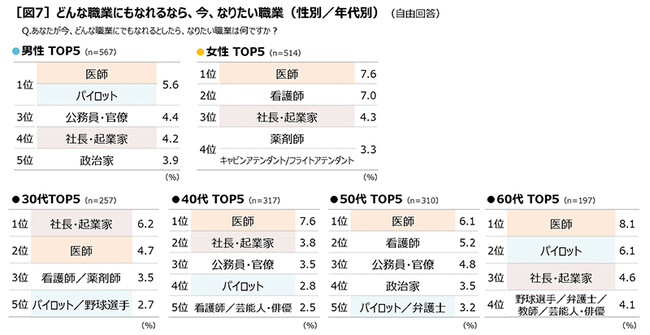 前述図5の今、大人がなりたい職業ランキングを男女別に見ると、男女とも「医師」がトップで、男性では「パイロット」も同率1位、女性は2位が「看護師」でした。女性の3位は「社長・起業家」ですが、男性は「公務員・官僚」が3位で、女性よりも安定志向が強いようです。年代別に見ると、30代のトップは「社長・起業家」ですが、40代以降は「医師」がトップという結果になりました[図7]。