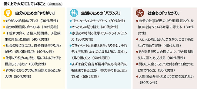 最後に、働く上で大切にしていることを聞きました。「やりがいと給料のバランス」(30代男性)、「オンとオフの切り替え」(40代女性)、「やりがいやワクワク」(50代男性)など、さまざまな意見が寄せられました。意見を分類すると、自分のための「やりがい」、生活のための「バランス」、社会との「つながり」が大事にされているようです。