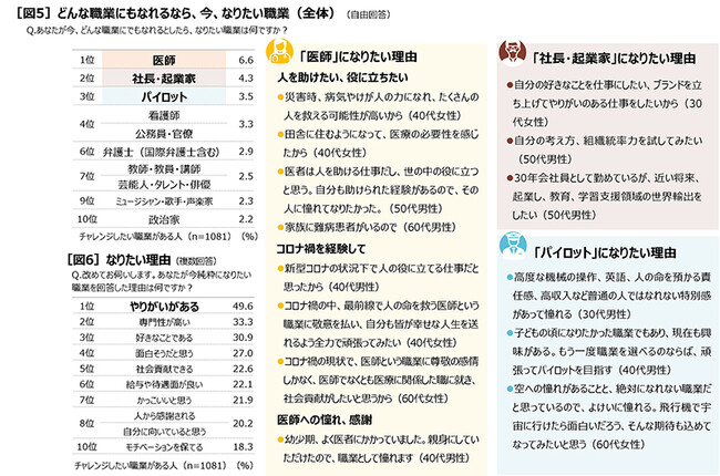 第1位「医師」、第2位「社長・起業家」、第3位「パイロット」。なりたい理由は第1位は「やりがい」