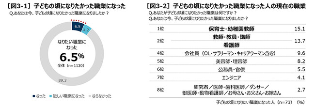 次に、いま現在、子どもの頃になりたかった職業になったかと聞くと、「なった」6.5%、「近しい職業になった」4.2%となり、ほぼ9割が「ならなかった」(89.3%)と答えています[図3-1]。なりたかった職業になったと答えた73人に現在の職業を聞くと、「保育士・幼稚園教師」(15.1%)、「教師・教員・講師」「看護師」(同率13.7%)、「会社員」(9.6%)、「美容師・理容師」(8.2%)の順となりました[図3-2]。少数ながらも、子どもの頃になりたかった職業を実現している大人たちがいます。