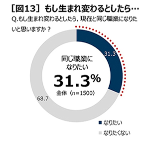 新しい職業が誕生し、多様な働き方が選択できる現在。もし生まれ変わるとしたら、現在と同じ職業になりたいと思うかと聞くと、3割は「なりたい」(31.3%)、7割は「なりたくない」(68.7%)と答えました[図13]。同じ職業になりたいと答えた人にその理由を聞くと、「やりがいがあるから」「うまくいくとうれしい」など、今の職業にやりがいを感じているので、同じ職業になりたい、という意見が多く挙げられました。一方、今と同じ職業にはなりたくないと答えた人は、その理由として、「もっと勉強しておけばよかった」といった後悔が大きく、次のチャンスがあれば「興味のある仕事」や「好きなこと」をしたいなど、やはりやりがいを求めて他の職業を目指すという人が多くなっています。前述図6・図10の結果の通り、大人の職業選択において「やりがい」は外せない条件となっているようです。
