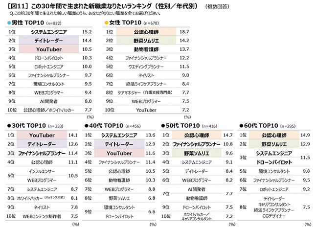 前述図9の新職業なりたいランキングを男女別で見ると、男性は「システムエンジニア」(15.2%)、「デイトレーダー」(14.4%)、「YouTuber」(10.5%)、女性は「公認心理師」(18.7%)、「野菜ソムリエ」(14.2%)、「動物看護師」(13.7%)がTOP3となりました。年代別で見ると、30代・40代は「YouTuber」「デイトレーダー」が上位3位内にランクインしているのに対し、50代以降は「公認心理師」や「野菜ソムリエ」の人気が高くなっています[図11]。