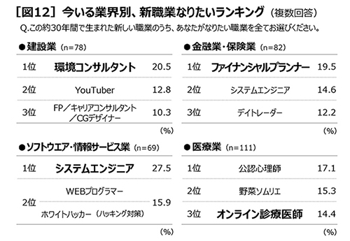 現在働いている業界別に、新職業なりたいランキングを見てみました。すると、建設業で働く人は「環境コンサルタント」(20.5%)、金融・保険業界で働く人は「ファイナンシャルプランナー」(19.5%)、ソフトウエアや情報サービスで働く人は「システムエンジニア」(27.5%)がなりたい新職業の1位となっています[図12]。