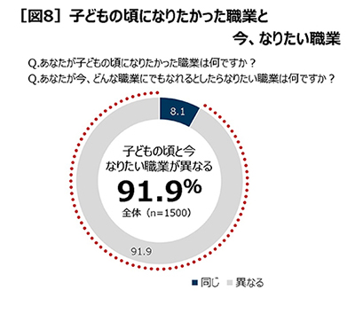 子どもの頃になりたかった職業(図2-1)と、大人になった今なりたい職業(図5)の各個人での変化を調べ、全体(1,500人)の中での割合を見てみました。すると、両者が変わらない人は8.1%と少なく、全体の91.9%は、子どもの頃になりたかった職業ではなく、新たな職業を選んでいます[図8]。
