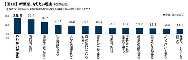 平成から令和にかけての30年間で、YouTuberやパーソナルトレーナーなどさまざまな新しい職業が誕生しています。これらの新しい職業の中から、事前の調査で認知度の高かった代表的な30種の職業を提示し、なりたい職業を選んでもらいました。その結果、「公認心理師(心理カウンセラー)」(12.7%)、「システムエンジニア(SE)」「ファイナンシャルプランナー(FP)」(同率10.9%)がなりたい職業の上位に選ばれました[図9]。なりたい理由を自由回答で聞くと、公認心理師は「困っている人を助けたい」、システムエンジニアは「今後の可能性」、ファイナンシャルプランナーは「人の役に立ちたい」といった意見が多く寄せられました。選択肢の中から選んでもらうと、やはり「やりがい」(35.5%)が一番の理由となっています[図10]。