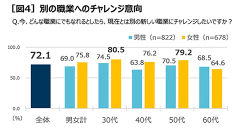 大人になった今、どんな職業にでもなれるとしたら、現在とは別の職業にチャレンジしたいか聞きました。性別や年齢、職業・キャリア、スキル、経済状況、家族構成・人間関係、居住地などの諸条件を一切考慮せずに、答えてもらいました。すると、全体の72.1%が「新しい職業にチャレンジしたい」と答え、男性(69.0%)より女性(75.8%)の意向が高く、中でも30代(80.5%)と50代(79.2%)の女性のチャレンジ意向が8割と高くなっています[図4]。