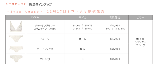 トリンプ・インターナショナル・ジャパン株式会社(本社:東京都中央区築地5-6-4、代表取締役社長:ヴァンサン・ネリアス)の直営店「AMOSTYLE BY Triumph(アモスタイル バイ トリンプ)以下 アモスタイル」から、バレエ戯曲「白鳥の湖」をモチーフにした華やかなシリーズ<Swan’s tears(スワンズ ティアーズ)>を、11月17日(木)よりアモスタイル店舗及びトリンプ・オンラインショップ(https://jp.triumph.com/amostyle/)にて順次発売します。