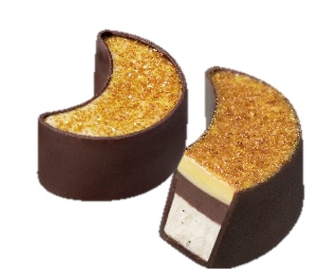 バニラ香るホワイトクッキークランブルムースに香ばしいアーモンドプラリネを重ね、月の形のダークチョコレートで包み込みました。キラキラあざやかなひと粒です。