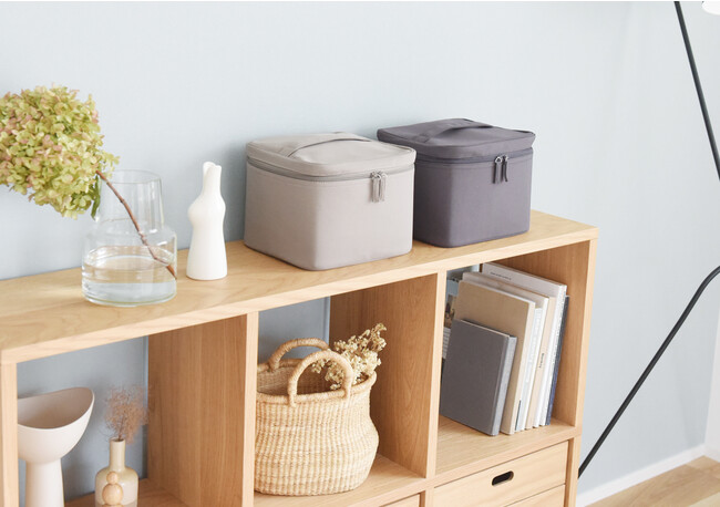 本体の素材はマットな微光沢素材のファブリック。まるでバニティポーチのような、一見救急箱には見えないデザインで、景観を崩さず置けるのがポイントです。