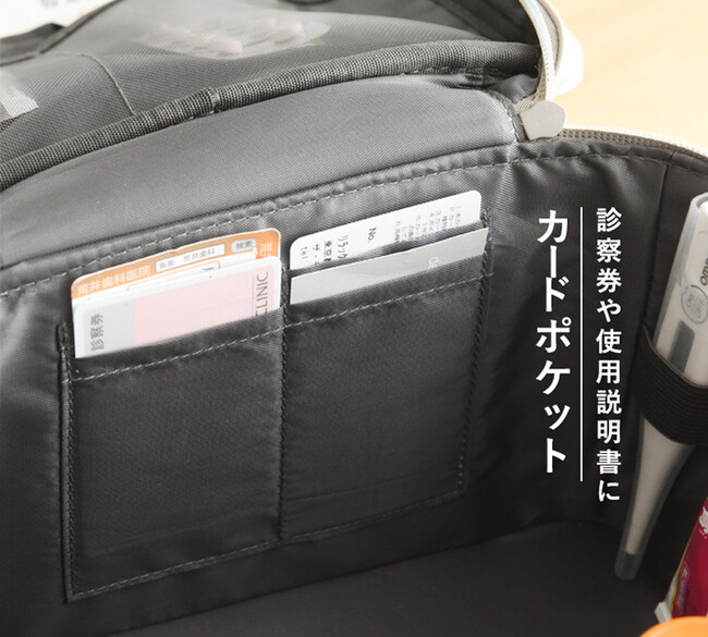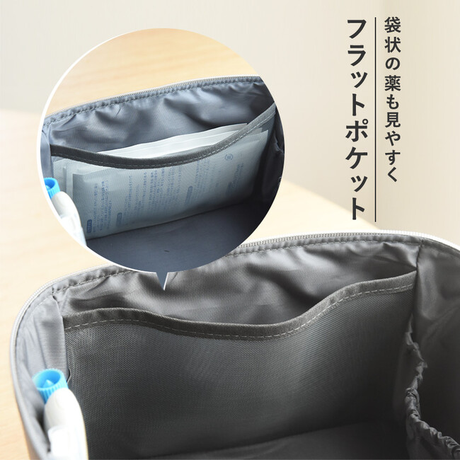 またポケットも豊富にあるので、病院で処方された袋入りの薬や、箱を捨ててしまってバラつく市販薬、体温計やチューブ薬など細々したものも、それそれ整理整頓しやすくなってます。