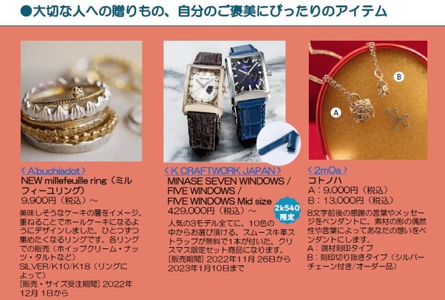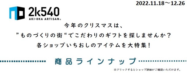 2022年11月18日(金)~12月26日(月)“日本のものづくり”をコンセプトとした、JR秋葉原駅~御徒町駅間の鉄道高架下に位置する商業施設『2k540 AKI-OKA ARTISAN(ニーケーコ゛ーヨンマル アキオカ アルチサ゛ン)』(以降、2k540)より、クリスマスにおすすめのギフトを紹介いたします。