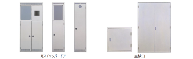 美観と使いやすさを考慮した、ガスチャンバードア(集合住宅の解放廊下に面したパイプシャフト部に取り付ける扉)と、点検口(設置機器部に取り付ける扉)です。
