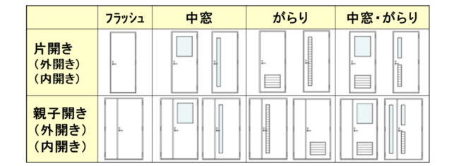扉タイプは、フラッシュ、中窓、がらりの組み合わせにより、採光・換気などの要望に合わせて対応が可能です。