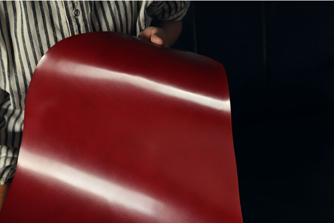 その他のカラーバリエーションはヴァーガンディ、ブラック、ブルー、カーキ。植物タンニンで鞣され、艶やかな光沢と透明感は唯一無二の美しさです。