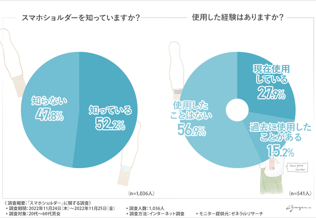 約半数がスマホショルダーを認知しており、その中で約4割が使用経験があることがわかりました。