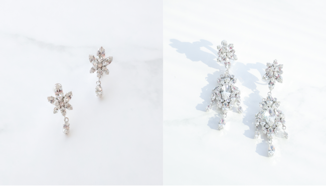 (左) 小ぶりながら輝きが目を惹くイヤリング。シンプルなデザインで、ウェディングシーンはもちろん、普段使いもしやすいアクセサリーです。