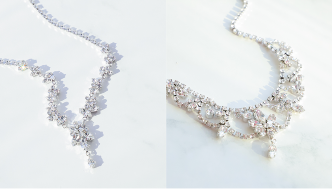(左)シンプルでさまざまなスタイルに合わせやすいネックレス。挙式はもちろん、お呼ばれやお出かけにも。