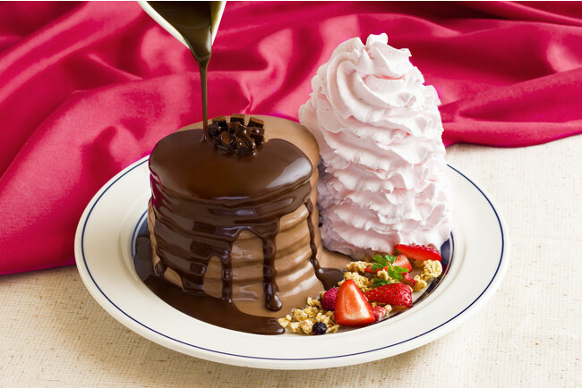 ナッツが香るチョコレートクリームをかけた濃厚なココア生地の中から甘酸っぱいストロベリークリームが溢れるバレンタイン限定のパンケーキ。温かいチョコレートガナッシュをかけてお召し上がりください。