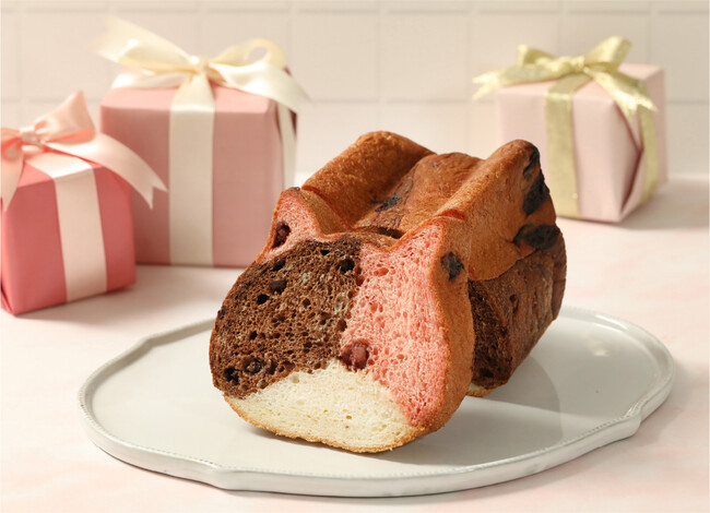 「ねこねこ食パン バレンタイン三毛猫」は、イチゴ味のチョコを混ぜたいちご風味の生地、チョコチップとクルミを混ぜたココア風味の生地、プレーン生地の3種類の味わいを一度に味わえる贅沢なねこねこ食パンに仕上げました。