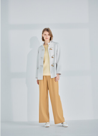 柔らかな風合いが特徴のアウターにはニットとパンツのシンプルな組み合わせ。アウターはアームホールにゆとりがあり、まだ寒さの残る時期から活躍。長くお使いいただける一品です。