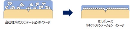 当社における従来の方法では、ファンデーションの開発において、カバー力の高さと塗布膜の薄さは相反するものであり、薄付きでありながら高いカバー力を実現することは最大の課題でした。今回の開発では従来の開発方法を刷新し、カバー力を持たせるための粉体に特殊な処理を行うことで、大幅に粉体の凝集を改善し、ファンデーションの厚みを減らすことに成功。肌の上に薄く隙間なく粉体顔料が並ぶため、厚ぼったさがなくなり、まるでその人の肌そのものが均一な美しさを持っているかのように演出します。