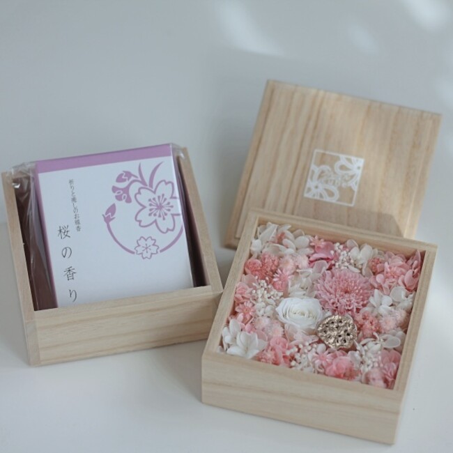 ”フルールcube”とは桐箱に入ったお供え花(プリザーブドフラワー)と香りをセットにしたもの。