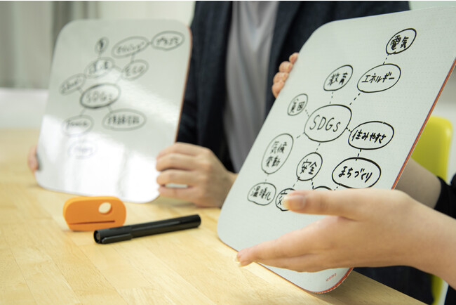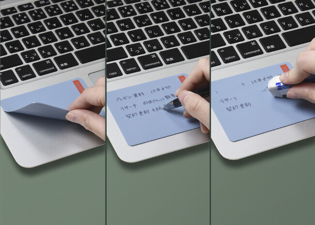 「いつでも どこでも かける おもいだせる」をテーマに、記憶に対する物理的/精神的なストレスを軽減する発想から生まれたプロダクト、それがwemo!油性ボールペンで書いて消して、何度でも使えるサスティナブルなウェアラブルメモです。書いた文字は濡れても消えないため屋外や水中での作業にも使用できます。目的やTPOに合わせて様々な製品タイプをご用意。2018年の”日本文具大賞 機能部門 優秀賞”、2021年の“日本文具大賞 デザイン部門 グランプリ”などを受賞し、発売以来累計90万個を販売しています。