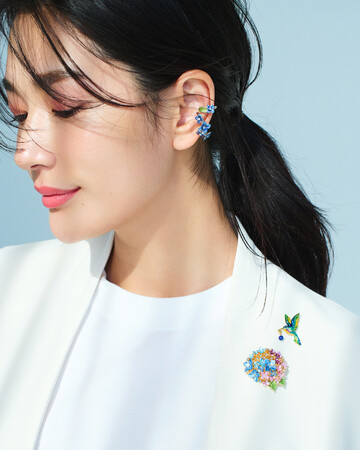 ブローチは、小さな花が集まって咲く愛らしいアジサイとラピスラズリを咥えたハチドリのデザイン。職人の手作業によるカラーリングは、ヴァンドームブティックならではのクオリティで胸元を華やかに演出します。