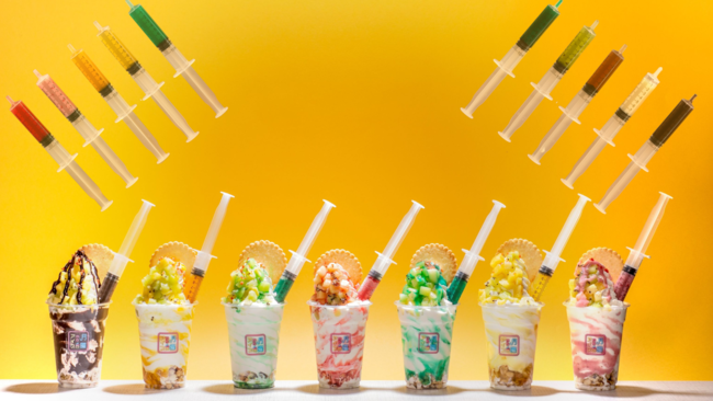 注射器にカラフルなソースが入った「10色の注射器推し色アイス」は、10色のソースから自分の好きな色を選んでお楽しみ頂けます。