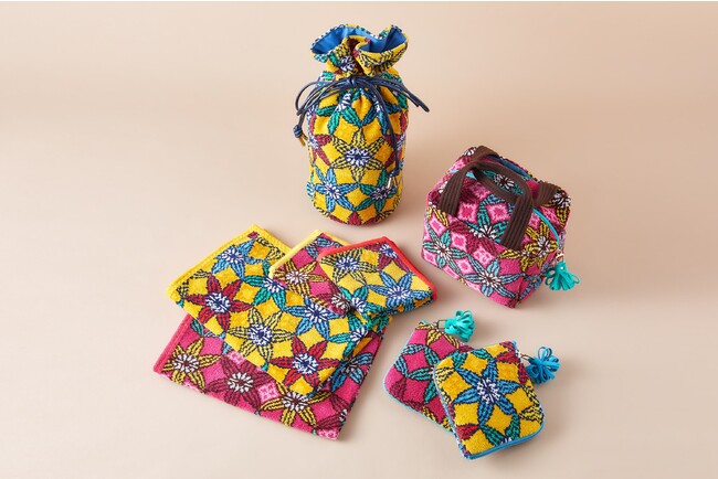 3月に発売される第一弾のテキスタイルの名前は「ドレスアップ」。愛や安らぎをテーマにしたアディンクラ(格言やメッセージを表すアフリカのシンボルマーク)と、花をモチーフにしたこの柄には「美しいもので包み込む」という意味が込められています。