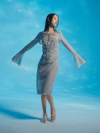 シアーオーガンザドレスには海や水、リフレクションを表した素材を使用し、自分だけの特別なものに 心惹かれるという水原さんのお話から、一つ一つ丁寧に作られるシェルやパールの手刺繍といったクチュール要素を取り入れています。同素材で作ったシアーオーガンザブラウスは、ファッショナブルでありながらも日常的に着用できる万能なアイテムとして水原さんから提案。レースミックスキャミソール ドレスは、ヴィンテージの要素も感じさせる海の波を模したレースやヒトデモチーフのレースなどのあしらいが特徴。23SS シーズンコンセプトである「Bloom in the mirror」を連想させる線対称のモチーフを起用しています。日常着にも特別な日にも、様々なシチュエーションに合わせてコーディネ ートし、楽しんでいただきたいアイテムです。