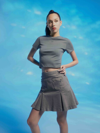デニムミニスカートは、水原さんにとって特にパワーをもらえるアイテムであり、歴史上でもパワフルな女性がファッションに取り入れていた印象があるということから、女性をエンパワーするアイテムとしてラインアップしました。コンパクトTシャツ、デニムミニスカート、デニムワンピースは、ボディラインを綺麗に見せることを大切にし、体にフィットする伸縮性のある素材を使用。また、各アイテムにカーゴディテールを施し、加工・色・パーツなど細部にも水原さんのこだわりを詰め込みました。