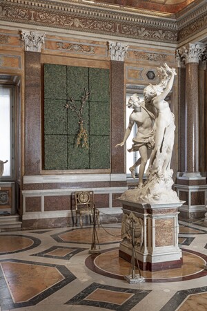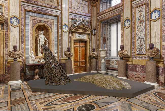 フランチェスコ・ストッチ(Francesco Stocchi)のキュレーションによる本展で、ボルゲーゼ美術館は、彫刻の不変の生命力と、1960年代後半から1970年代前半にかけてイタリアで興った「貧しい芸術」を意味する芸術運動、「アルテ・ポーヴェラ(Arte povera)」の巨匠への賛辞を込めて、再び現代に開かれた美術館となります。マリアーノ・ロッシ(Mariano Rossi)の大広間、アポロンとダフネ(Apollo and Daphne)の間、皇帝(The Emperors)の間、アイネイアースとアンキーセース(Aeneas and Anchises)の間から庭にかけて、1970年代から2000年代初頭までに制作された30以上の作品が、本館の各所に展示されています。