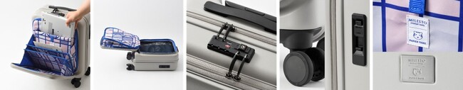 ※左からフロントポケット(クッションスリーブ付き)、フロントからのメインポケット開閉イメージ、TSロック、キャスターとストッパー、ダブルロゴ