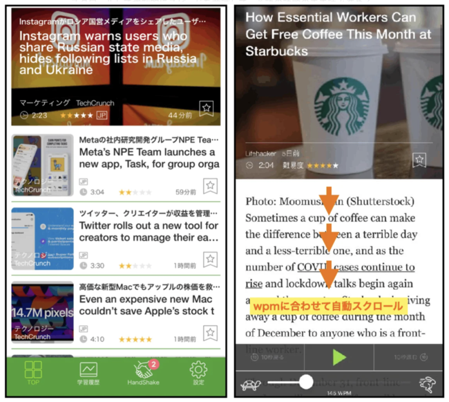 英文をリーディングする際に、設定したWPMに沿って自動でスクロールして強制的にスピードを意識して、英語の語順のまま読み進めるトレーニングをする事ができます。