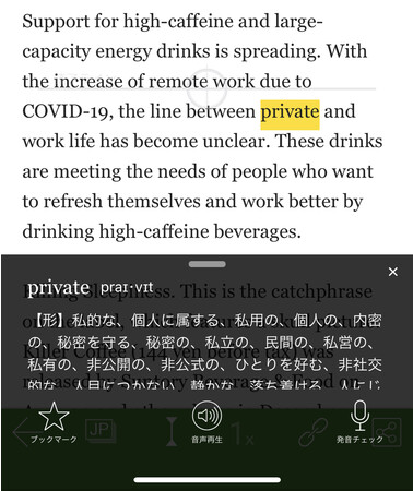 わからない単語は、単語の上をタップするとワンタップ辞書で意味を確認しながら読み進めることができます。一度調べた単語は記録されて「My単語帳」に蓄積されます。その中からプッシュ通知で単語クイズが出題する事も可能です。また、ドラッグすると熟語の検索も可能です。