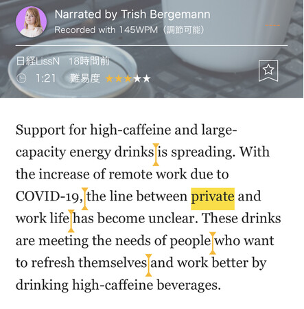 英語を意味の区切りで分割し英語の語順のまま英文を理解できるようにするためのトレーニング方法です。レシピーでは区切りの細かさを上級者向け、初級者向けの2段階で用意しています。そのため、既に英文を難なく読める方でもスラスラとより早く読むトレーニングとして活用できますし、TOEICのリーディングセクションで時間が足りなくなってしまうという英語学習初心者に非常におすすめの機能となっています。