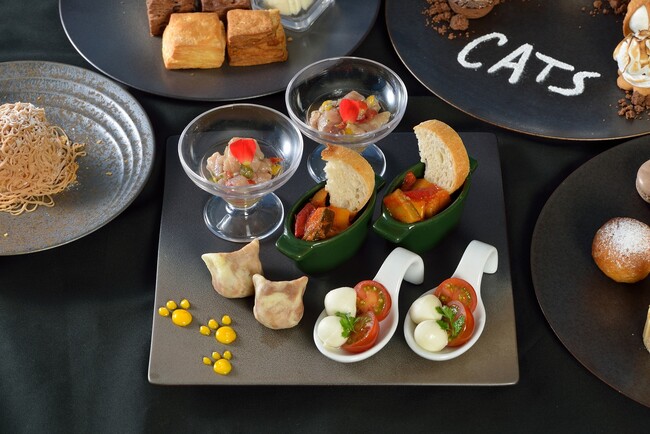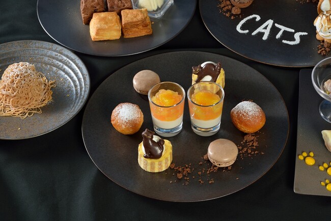 現在、名古屋四季劇場で上演されている劇団四季ミュージカル『キャッツ』の日本公演は、1983年に始まり、2023年11月に40周年を迎えます。また名古屋の初演は1988年に当ホテルが位置する“ささしまライブエリア”で行われたことから、この歴史ある場所で40周年を祝し、コラボレーションアフタヌーンティーを考案いたしました。劇中で印象的な月が輝く夜空のシーンをイメージした銀箔入りのウェルカムドリンクから始まり、登場するキャラクターのうち9匹の見た目や特徴からインスピレーションを得たスイーツやセイボリーをご用意。まるでステージにいるようなプチスイーツは見た目にもこだわったパティシエの渾身作。地上140mの空間で名古屋四季劇場を眺めながら、選ばれしジェリクルキャッツならぬ、お気に入りのスイーツを見つけながら、『キャッツ』の世界をお楽しみいただけます。