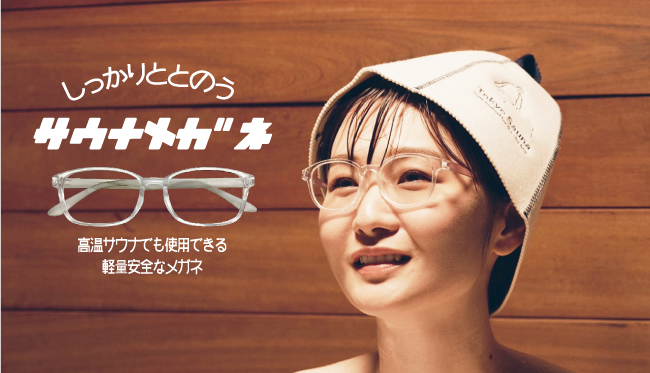 2010年の発売以降、人気アイテムとなっているお風呂メガネ「アイラブ入浴」。人気のボスリントン型とスクエア型のクリアフレームになって、リニューアルしたものが『サウナメガネ』です。