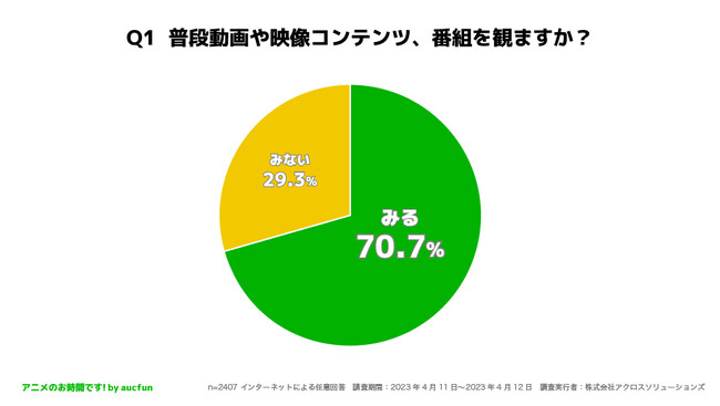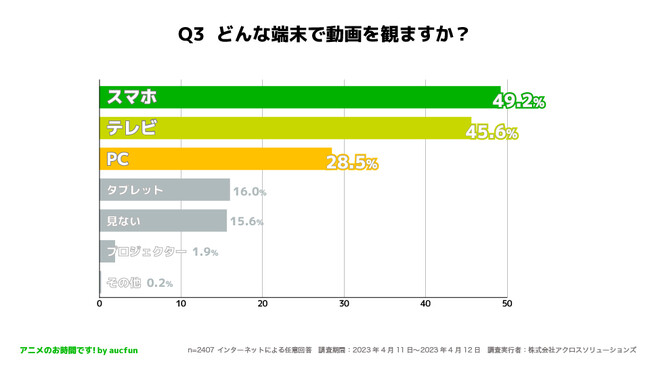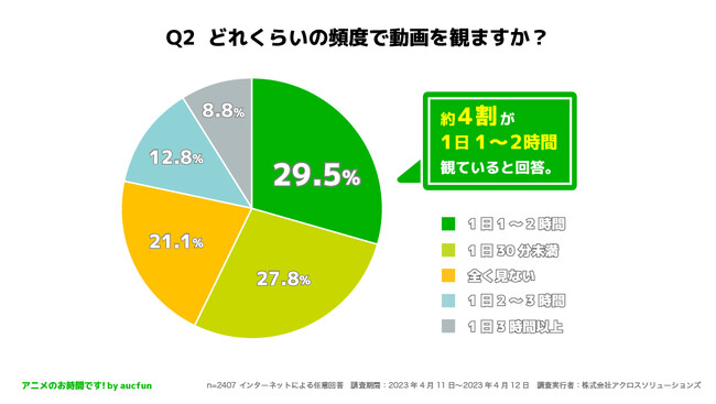 株式会社アクロスソリューションズと株式会社オークファンが共同運営しているアニメのお時間です!(URL:https://aucfan.com/vod/)は、20歳~59歳の男女2407人を対象に「動画視聴に関するアンケート調査」を実施しました。