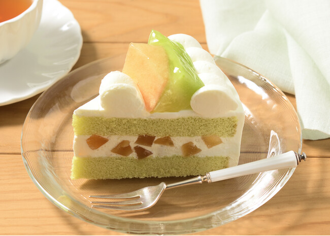 香り高い旬の熊本県産メロンを使用。濃厚な甘みの“赤肉メロン”と、爽やかな甘みの“青肉メロン”を上面に飾った季節限定のショートケーキです。メロン&りんごのゼリーと、メロンと相性のよいカスタード入り練乳クリームをメロン風味スポンジでサンド。口いっぱいに広がる、メロンの豊かな甘みと香りをお楽しみください。
