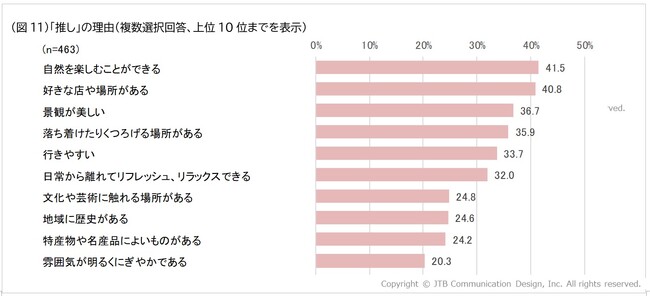 「推し」の地域が好きな理由としては、「自然を楽しむことができる」41.5%、「好きな店や場所がある」40.8%、「景観が美しい」36.7%、「落ち着けたりくつろげる場所がある」35.9%、「行きやすい」33.7%、「日常から離れてリフレッシュ、リラックスできる」32.0%などが上位に挙げられています。(図11)